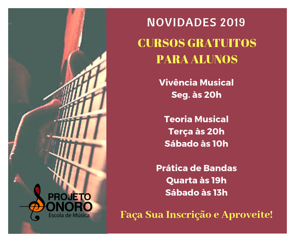 Agora os alunos da Projeto Sonoro poderão aproveitar ainda mais de seu curso de música. Trouxemos mais novidades neste ano. São diversas atividades GRATUITAS para que os alunos possam aprender muito mais de forma muito didática e divertida! Todos os dias temos atividades, basta se inscrever ou agendar conforme sua agenda!